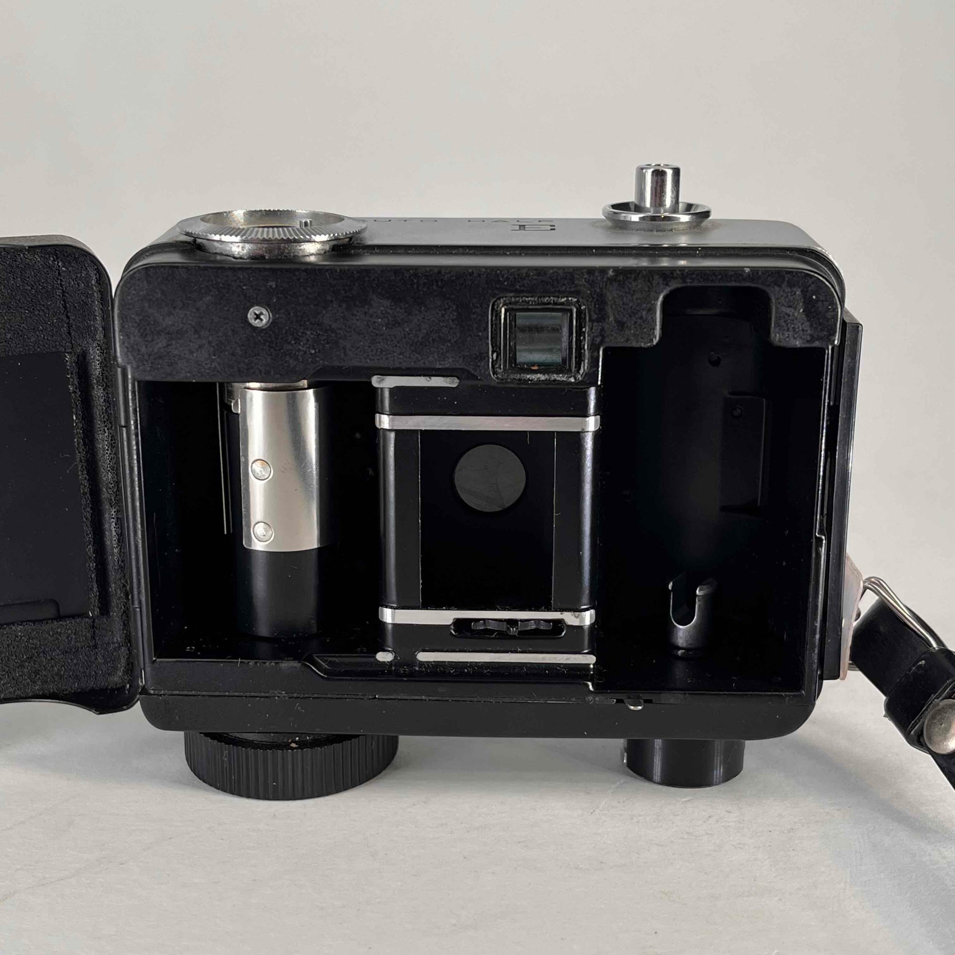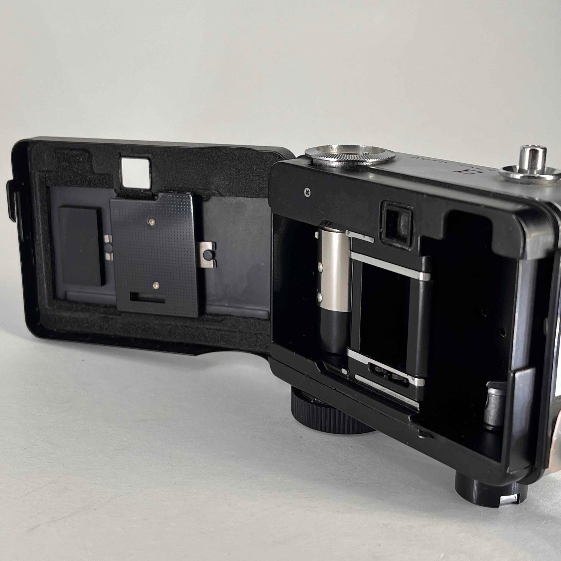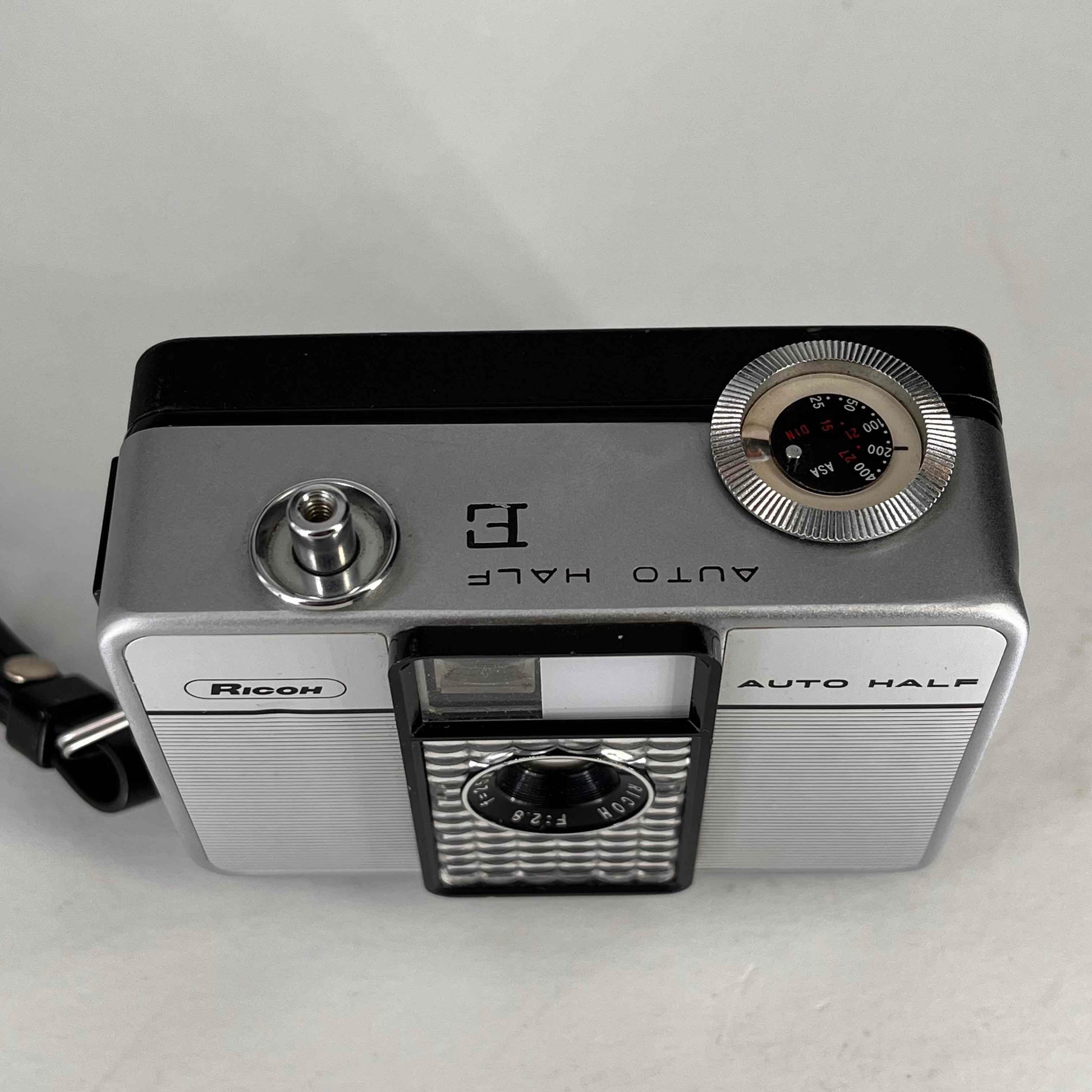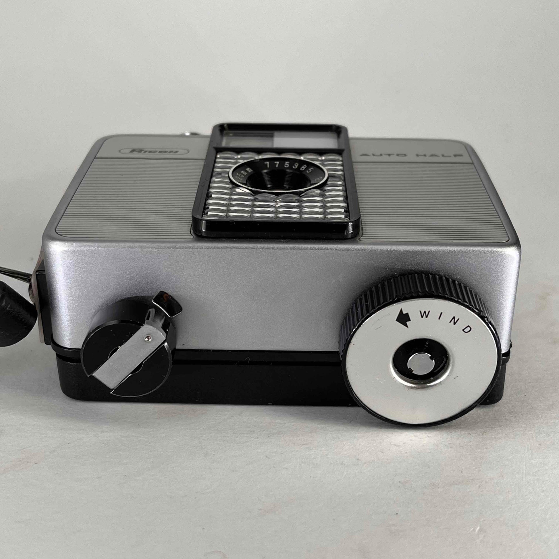 The original Ricoh Auto Half was made in Japan by Ricoh from c.1960-1963, with revised versions appearing through the 1970s. Several styling variations are known. All were 35mm half frame cameras, with clockwork motor film advance for 25 to 30 exposures. The 25mm f/2.8 3 groups 4 elements lens was surrounded by the selenium cell operating the exposure metering, setting aperture automatically, with manual override option. Shutter speeds were 1/30 sec. (flash sync., apperture override option) or 1/125 sec. with automatic exposure.