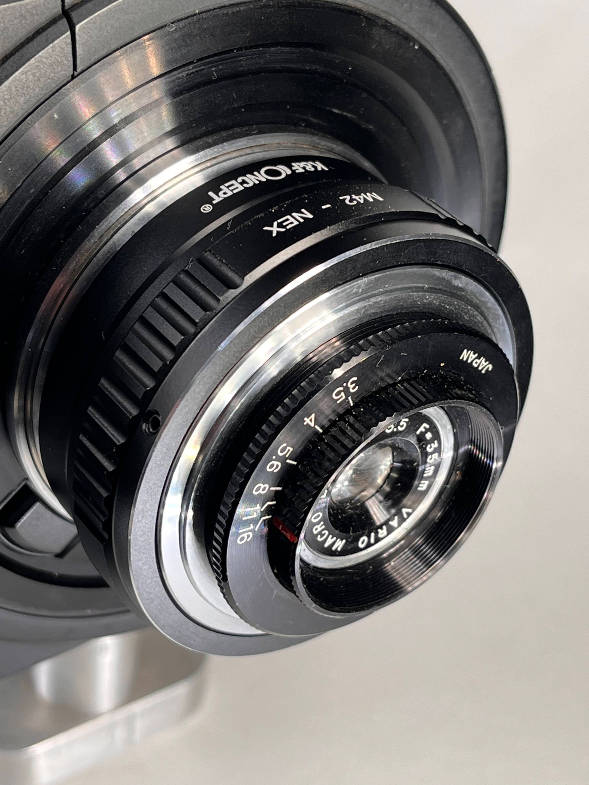 This lens can only be used on a bellows assembly because it does not have a focusing helicoid. It uses T2 adaptor mounts to enable it to fit various manufacturer’s bellows. It is currently fitted with a M42 screw thread mount, so in order to fit it to a bellows that doesn’t use M42, you can either change the T2 mount, or simply use an adaptor that you can screw the M42 mount into.